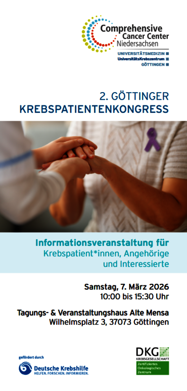 Aus der Ankündigung.Wir danken der Deutschen Krebshilfe für die erneute Förderung! Eine Krebserkrankung stellt Betroffene und ihr Umfeld oft vor große und unerwartete Herausforderungen. Fundierte Informationen zu Erkrankung, Therapie und Unterstützungsangeboten können helfen, diese besser zu bewältigen. Auch in diesem Jahr haben wir gemeinsam mit unseren Expert*innen der UMG und der MHH sowie zahlreichen Kooperationspartnern ein vielseitiges Programm für Sie zusammengestellt. Dazu zählen regionale und überregionale Selbsthilfegruppen, die Niedersächsische Krebsgesellschaft, die Krebsberatungsstelle der Diakonie Göttingen sowie die Kontakt-, Informations- und Beratungsstelle im Selbsthilfebereich (KIBIS). Freuen Sie sich auf Vorträge zu aktuellen Entwicklungen der Krebsmedizin und zu unterstützenden Maßnahmen aus den Bereichen komplementäre Medizin, Psychoonkologie, psychosoziale Unterstützung, Ernährung und Sport. Persönliche Erfahrungsberichte von Betroffenen sowie Informationen zu ehrenamtlichen Selbsthilfetätigkeiten runden das Angebot ab. Der Kongress bietet Ihnen die Möglichkeit, in einer offenen und einladenden Atmosphäre mit anderen Betroffenen, Selbsthilfegruppen und Expert*innen in den Austausch zu treten.